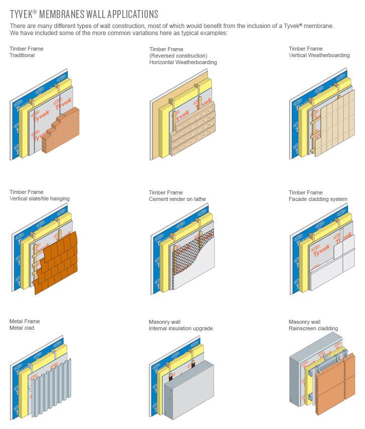 Membrany oddychające DuPont™ Tyvek® mogą być stosowane w ścianach, aby utworzyć skuteczną barierę wodoodporną, zapewniającą ochronę przed wilgocią zewnętrzną, kondensacją i przenikaniem powietrza.